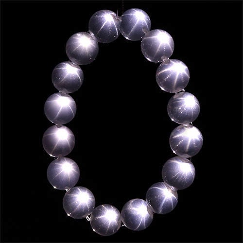 厳選したスターが強く内包物の少ない球を厳選して作成し、貫通穴ではなく端に小さな穴をあけて繋いだ全珠スターローズクォーツの登場です。