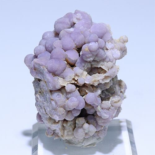 グレープアゲートがぶどうの房のような形状を持つ主な要因は、結晶成長と化学組成の変化に起因します。火山灰の泥の中で育つといわれており、海底に積もった溶岩の隙間で冷却される際、微小な空間に結晶が成長し、外部環境の影響や色素の不均等な分布が、球状の粒が集まったような姿を形成するといわれています