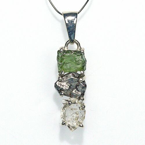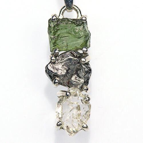 鉄隕石、「モルダバイト」原石、ハーキマーダイヤモンドのレアストーン3石の組み合わせが魅力的なシルバー925製ペンダントトップです。