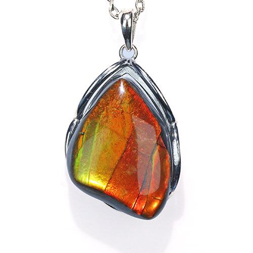 カナダのアルバータ州の地層からのみ産出される希少な素材です。角度により美しいイリデッセンス(遊色効果)が見られるアンモライトのペンダントトップです。