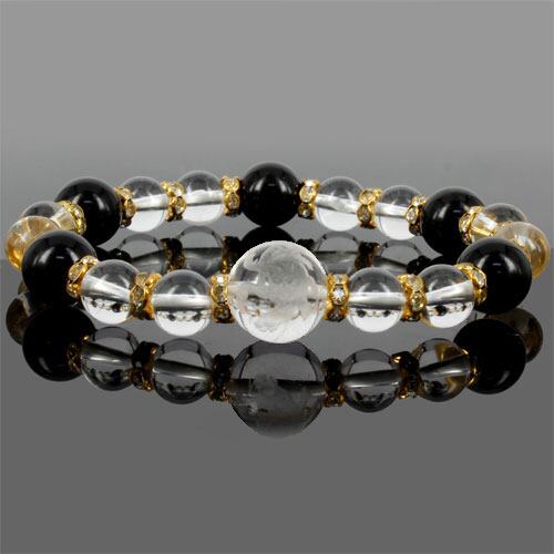 オニキスと金のロンデル透明度の美しい9mm水晶を配したデザインには