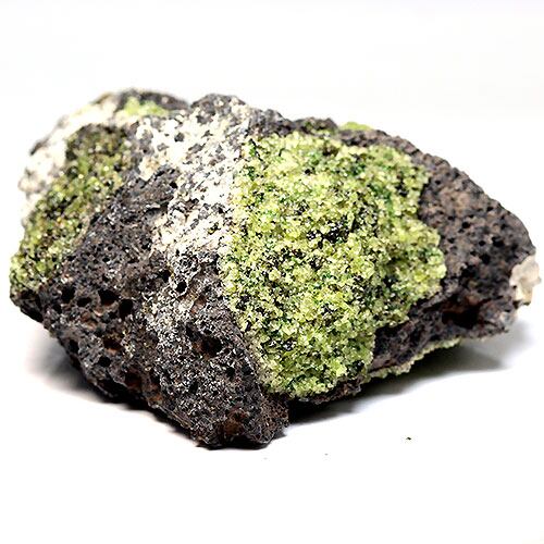 その経緯が良く分かる溶岩の母岩付きのペリドットの原石です。